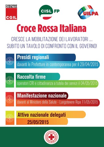 Il 13 aprile 2015 i segretari generali di FP Cgil, Cisl Fp e Uil PA hanno chiesto un incontro urgente al Ministro della Salute, Beatrice Lorenzin, al fine di aprire un tavolo di confronto sulla riorganizzazione della Croce Rossa Italiana, con l’obiettivo di utilizzare la proroga prevista dal d.l. 199/2014, c.d.milleproroghe, per apportare le modifiche necessarie al d. l.vo n. 178/2012 e per operare un vero riordino dell’Ente, che garantisca il mantenimento dei servizi erogati alla collettività e salvaguardi i livelli occupazionali e retributivi dei lavoratori.