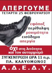 Il sindacato della funzione pubblica ADEDY ha indetto la giornata di mobilitazione, ed una manifestazione ad Atene, con le parole d’ordine “I lavoratori non devono pagare la crisi”, ADEDY esprime la sua opposizione alle misure del governo greco che usa la crisi per rendere ancora più precario il lavoro, tagliare i servizi pubblici, aumentare la privatizzazione e che mette sotto attacco i diritti pensionistici.