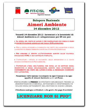Venerdì 14 dicembre 2012 i lavoratori e le lavoratrici di Aimeri Ambiente s.r.l. sciopereranno per 24 ore Chiediamo sostegno ai Sindaci e alla gente che paga il servizio!LICENZIARE NON SI PUO’!
