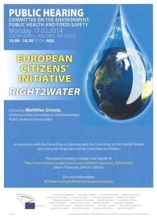 È in programma per il 17 febbraio 2014 dalle ore 15 alle 18,30 l’audizione pubblica del Parlamento Europeo sull’ICE Right2water, organizzata dal comitato Ambiente (ENVI) del Parlamento Europeo.