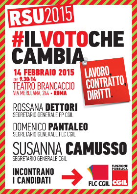 Teatro Brancaccio – Via Merulana, 244, Ore 9.30/14 – Rossana Dettori Segretaria Generale FP CGIL, Domenico Pantaleo Segretario Generale FLC CGIL e Susanna Camusso Segretario Generale CGIL incontrano i Candidati.