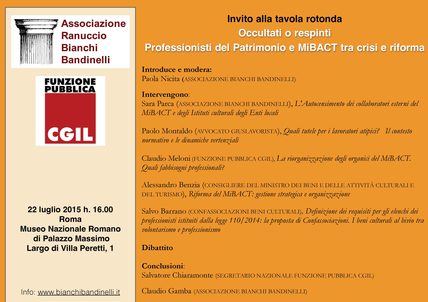 In allegato la brochure relativa all’iniziativa congiunta con l’Associazione Bianghi Bandinelli, che si terrà il 22 luglio a Palazzo Massimo a Roma, sul tema del lavoro nei beni culturali con particolare riferimento alla condizione del personale esternalizzato in collaborazione professionale nel contesto della individuazione dei nuovi fabbisogni organici in conseguenza della riforma del MIBACT.