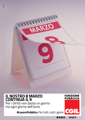 La presenza delle donne nel settore dei lavori pubblici, preponderante numericamente su quella degli uomini, la necessità di politiche contrattuali mirate, specifiche, con un maggiore interesse al benessere lavorativo e al soddisfacimento di bisogni più specificamente femminili ci vede impegnati come FP CGIL da sempre e in questa fase di rinnovo contrattuale in particolare. Lo slogan utilizzato “Il nostro 8 marzo continua il 9” manifesta la costante quotidiana presenza della Funzione Pubblica CGIL al fianco delle lavoratrici (e dei lavoratori) per la difesa e la conquista dei diritti.