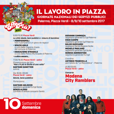 Nel pomeriggio, in piazza Verdi sul palco della kermesse promossa dalla categoria dei lavoratori pubblici della Cgil, alle 17.30 la presentazione del libro di Gaetano Savatteri dal titolo ‘Non c’è più la Sicilia di una volta’. A seguire, alle ore 18.30, sempre sul palco centrale, il dibattito ‘Salute, Bene Pubblico’ con Gaetano Agliozzo, segretario generale Fp Cgil Sicilia; Renzo Alessi, comitato di settore comparto Sanità; Giovanni Cammuca, segretario generale Fp Cgil Palermo; Enzo Campo, segretario generale Cgil Palermo; Baldo Gucciardi, assessore Sanità Regione Sicilia; Michele Pagliaro, segretario generale Cgil Sicilia; Serena Sorrentino, segretaria generale Fp Cgil Nazionale; coordinati da Antonio Fraschilla, giornalista de ‘La Repubblica’ di Palermo.