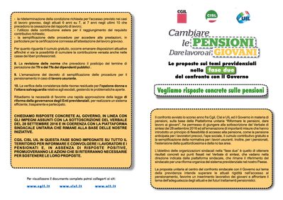 Cgil, Cisl e Uil hanno presentato alla Presidenza del Consiglio dei Ministri e al Ministero del Lavoro e delle Politiche sociali una proposta unitaria sui temi al centro del confronto della fase due sulla previdenza. Le proposte intendono superare le attuali rigidità e favorire il turn over generazionale per rendere più equo l’attuale sistema previdenziale.