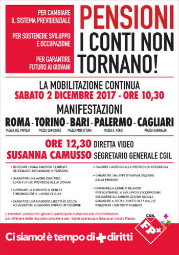 “Per cambiare il sistema previdenziale, per sostenere sviluppo e occupazione, per garantire futuro ai giovani”. Questi i motivi della mobilitazione nazionale della Cgil di sabato 2 dicembre, proclamata dopo l’esito del confronto con il Governo sul tema della previdenza, considerato “insufficiente”.