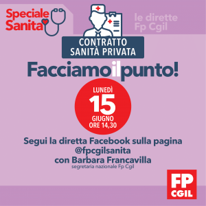 Speciale Sanità, tre dirette Facebook promosse dalla Fp Cgil Sanità in sei giorni: mercoledì 10 giugno sul rinnovo del contratto della Sanità Pubblica 19/21, venerdì 12 sulle professioni infermieristiche e lunedì 15 sulla trattativa per il rinnovo del contratto della Sanità Privata. La Funzione Pubblica Cgil organizza, infatti, tre momenti di confronto e proposte attraverso altrettante dirette Facebook sulla pagina della Fp Cgil Sanità (@fpcgilsanita), tutte a partire dalle ore 14.30.