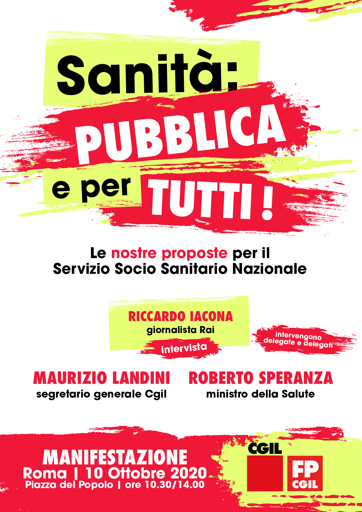 ‘Sanità: pubblica e per tutti! Le nostre proposte per il Servizio socio sanitario nazionale’. È il titolo della manifestazione promossa da Cgil e Funzione Pubblica Cgil in programma a Roma sabato 10 ottobre in piazza del Popolo dalle ore 10.30 alle ore 14. Una manifestazione che vedrà interventi di delegate e delegati del settore, insieme a un confronto tra il ministro della Salute, Roberto Speranza, e il segretario generale della Cgil, Maurizio Landini, moderato dal giornalista della Rai, Riccardo Iacona.