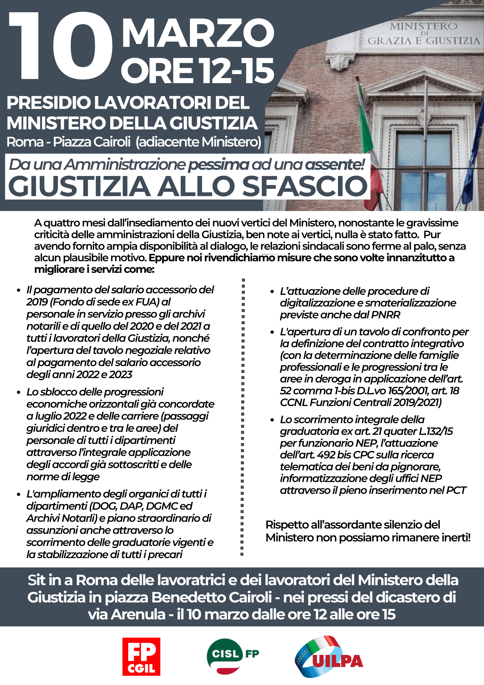 “Giustizia allo sfascio”. Fp Cgil, Cisl Fp e Uilpa promuovono per venerdì 10 marzo a Roma un presidio nei pressi del Ministero della Giustizia, in piazza Benedetto Cairoli dalle ore 12. “A quattro mesi dall’insediamento dei nuovi vertici del Ministero – motivano le ragioni della protesta i sindacati -, nonostante le gravissime criticità delle amministrazioni della Giustizia, ben note ai vertici, nulla è stato fatto. Pur avendo fornito ampia disponibilità al dialogo, le relazioni sindacali sono ferme al palo, senza alcun plausibile motivo”.