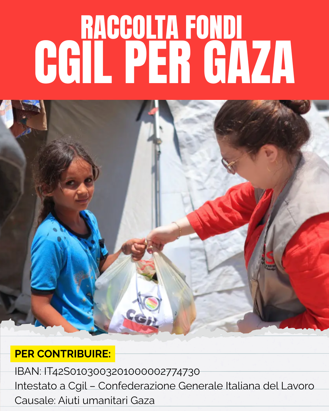 Dall’inizio del conflitto, nell’autunno 2023, la CGIL ha avviato una raccolta fondi per l’invio di aiuti umanitari alla popolazione civile della Striscia di Gaza.