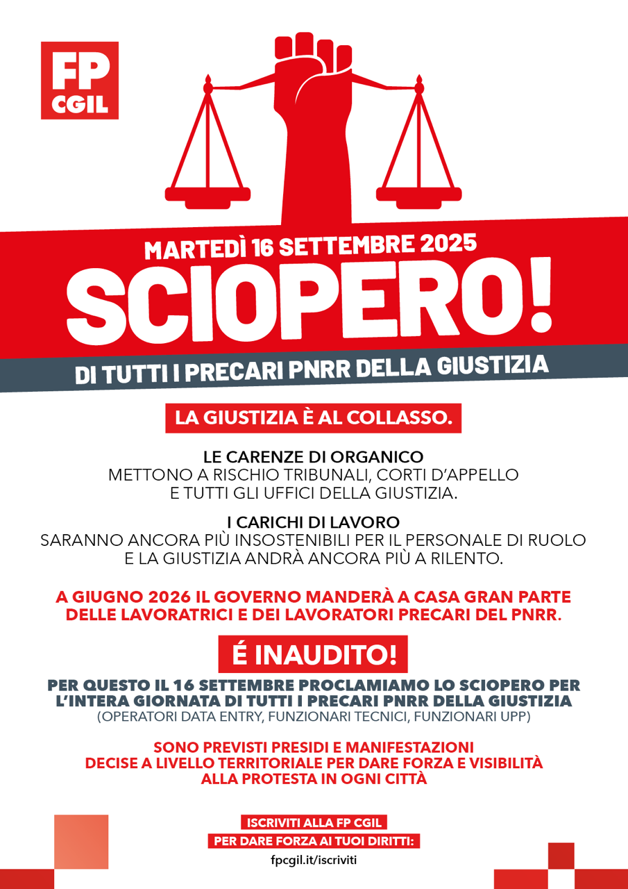 Domani, martedì 16 settembre la Funzione Pubblica Cgil ha promosso lo sciopero, per l’intera giornata, dei 12mila lavoratori precari della Giustizia: si tratta di operatori data entry, funzionari tecnici (tecnici di amministrazione, tecnici edili, tecnici contabili, tecnici IT), funzionari addetti all’ufficio per il processo che, a partire da febbraio 2022, sono stati assunti a tempo determinato grazie ai fondi del PNRR e che il 30 giugno 2026 vedranno scadere i propri contratti individuali.