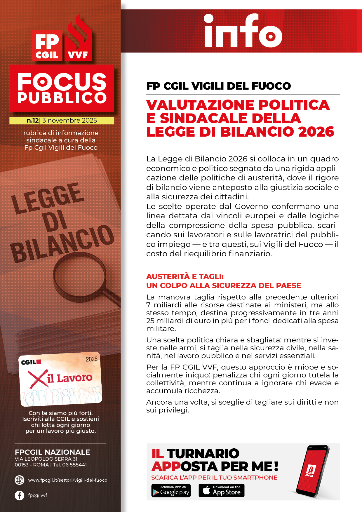 La Legge di Bilancio 2026 è una manovra di tagli, non di prospettive. Non dà risposte ai Vigili del Fuoco, non valorizza il servizio pubblico, non riconosce il lavoro di chi ogni giorno garantisce sicurezza, soccorso e solidarietà. La FP CGIL Vigili del Fuoco denuncia con forza una politica che considera il lavoro pubblico una spesa da ridurre anziché un investimento per il Paese. La sicurezza non è un costo, ma un diritto collettivo. Continueremo la mobilitazione e il confronto politico per rivendicare risorse, diritti e dignità per le lavoratrici e i lavoratori del Corpo Nazionale dei Vigili del Fuoco.