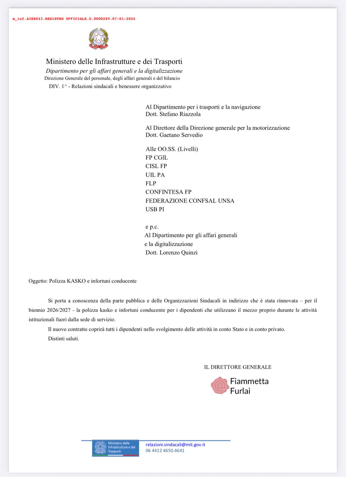 Le scriventi organizzazioni sindacali comunicano a tutte le lavoratrici ed i lavoratori del MIT che, con nota prot. 289 del 07.01.2026 che alleghiamo, l’Amministrazione ci ha informato di aver rinnovato, per il biennio 2026/27, la Polizza Kasko infortuni conducente per i dipendenti che utilizzano il mezzo proprio durante le attività istituzionali fuori dalla sede di servizio; il nuovo contratto coprirà tutti i dipendenti nello svolgimento delle attività in conto Stato e in conto privato.