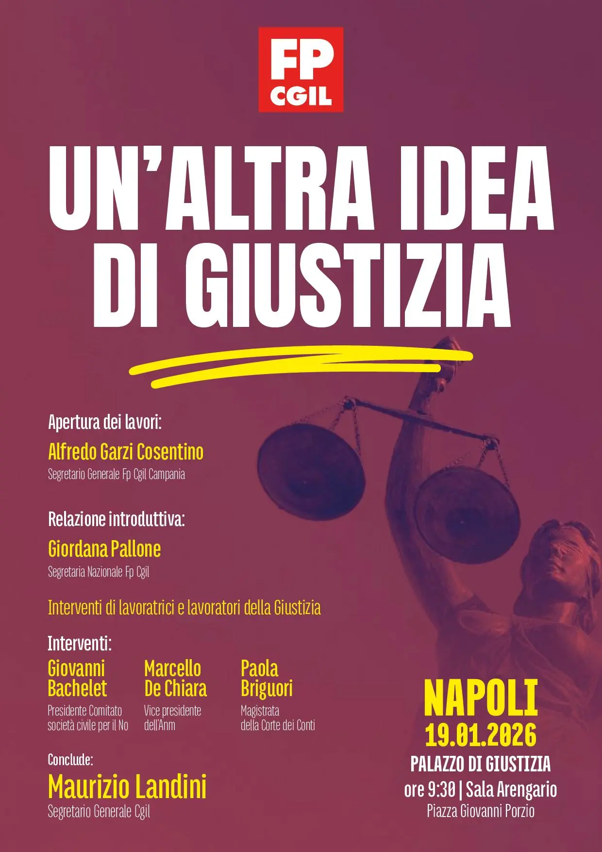 “Un’altra idea di giustizia” è il titolo dell’iniziativa che si svolgerà lunedi 19 gennaio a Napoli alle ore 9,30 (Palazzo di Giustizia, Sala Arengario, piazza Giovanni Porzio), promossa dalla Fp Cgil.