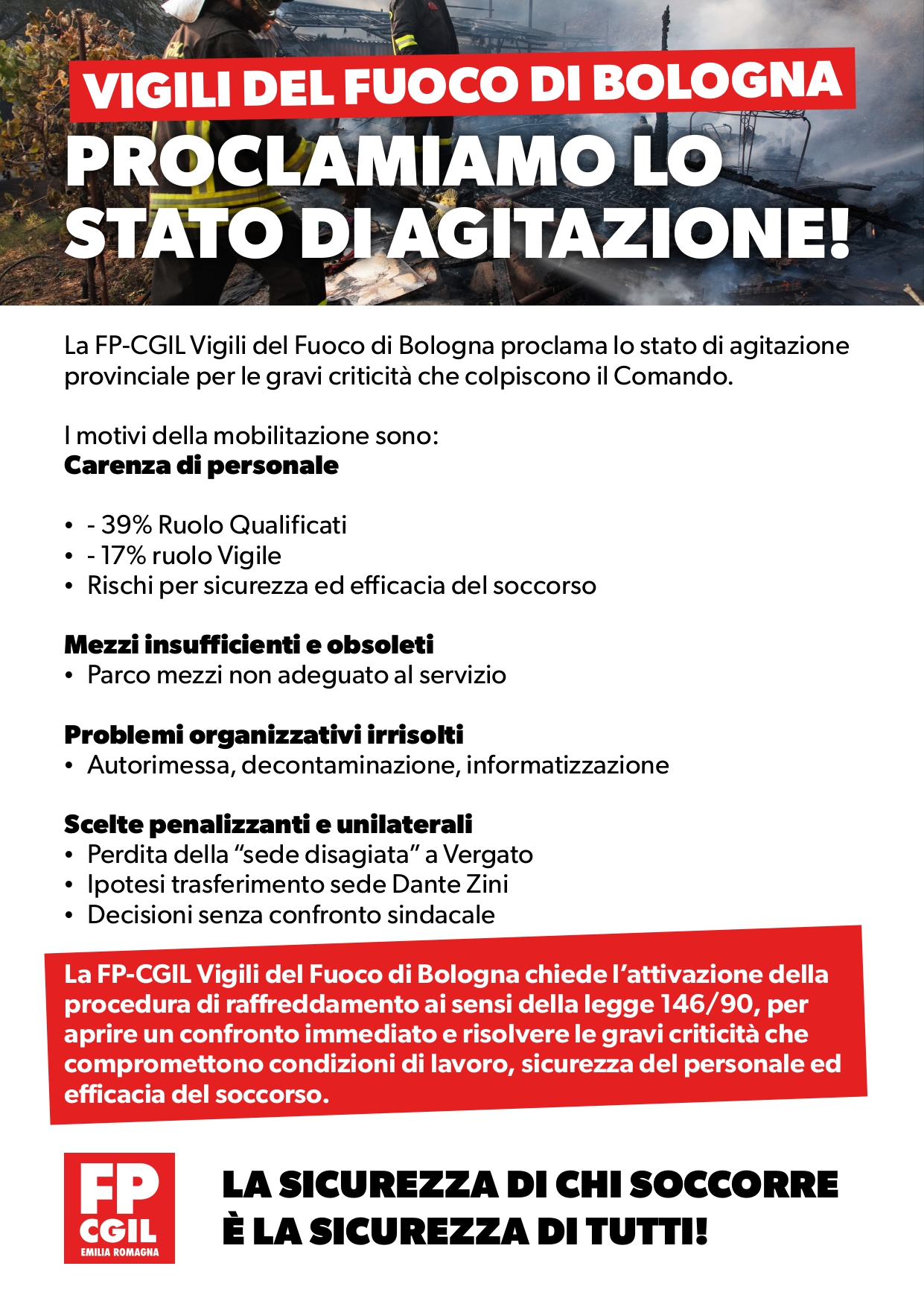 Il perdurare dell’assenza di risposte alle richieste a tutela delle lavoratrici e dei lavoratori e le mancate relazioni sindacali hanno indotto il Coordinamento Provinciale FP CGIL VVF a proclamare lo stato di agitazione.