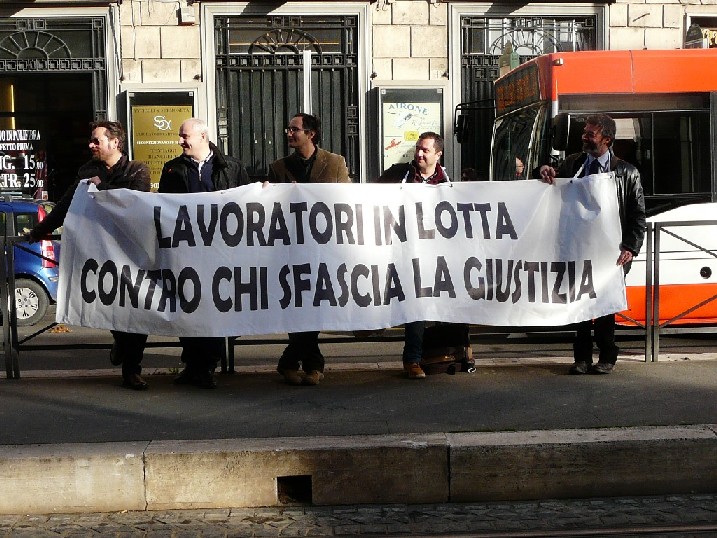 All’esterno dell’aula, davanti al Ministero in via Arenula, alcuni rappresentanti delle OO.SS. FPCGIL, RdB, FLP e UIL–PA si sono incatenati con uno striscione al collo con la scritta “LAVORATORI IN LOTTA CONTRO LO SFASCIO DELLA GIUSTIZIA”; all’interno del Ministero contemporaneamente i rappresentanti delle stesse OO.SS hanno interrotto la riunione mostrando dei cartelli con la medesima scritta.