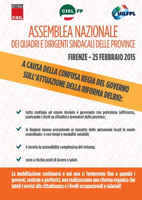 “Saranno oltre 20.000 i lavoratori delle Province potenzialmente interessati da mobilità e collocamento in disponibilità, qualora gli esuberi non venissero assorbiti in altri Enti della Pa. Un processo così delicato – si legge in una nota congiunta dei tre sindacati di categoria – non può essere accompagnato da una regia confusa come quella che ha caratterizzato il Governo sino ad ora. Non è accettabile infatti che l’Esecutivo non abbia presidiato attentamente il rispetto delle scadenze stabilite dalla legge e dai relativi provvedimenti attuativi (Accordo Stato Regioni e DPCM), consentendo in tal modo l’accumularsi di un ingente ritardo sul cronoprogramma iniziale. Come risulta tutt’ora incomprensibile che nel riassetto la salvaguardia occupazionale, espressamente prevista dalla Legge Delrio, sia stata compromessa dal taglio lineare stabilito dalla legge di stabilità 2015”.