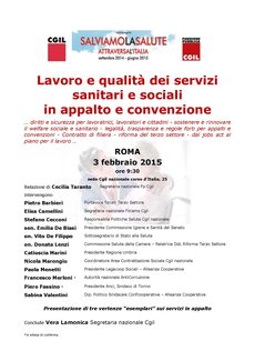 I lavori saranno aperti dalla relazione di Cecilia Taranto (segretaria nazionale Fp Cgil). Sono previsti gli interventi di: Pietro Barbieri (portavoce Forum Terzo Settore), Elisa Camellini (segretaria nazionale Filcams Cgil), Stefano Cecconi (responsabile Politiche Salute Cgil nazionale), sen. Emilia De Biasi (presidente Commissione Igiene e Sanità del Senato), on. Vito De Filippo (sottosegretario di Stato alla Salute), on. Donata Lenzi (Commissione Salute della Camera, relatrice DdL Riforma Terzo Settore), Catiuscia Marini (presidente Regione Umbria), Nicola Marongiu (coordinatore Area Contrattazione Sociale Cgil nazionale), Paola Menetti (presidente Legacoop Sociali – Alleanza Cooperative), Francesco Merloni (Autorità Nazionale Anticorruzione), Piero Fassino (presidente Anci e sindaco di Torino), Sabina Valentini (Dip. Politico Sindacale Confcooperative – Alleanza Cooperative). Le conclusioni saranno affidate alla segretaria confederale Cgil Vera Lamonica.