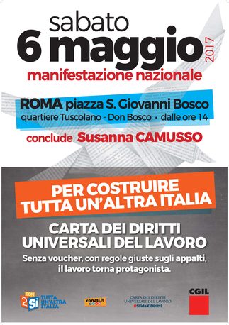 Per questo motivo, ‘per costruire tutta un’altra Italia’, dando seguito a quanto deciso dagli oltre 1500 quadri e delegati della Cgil che sabato scorso si sono riuniti al Teatro Brancaccio di Roma, sabato 6 maggio si svolgerà a Roma, dalle ore 14, in piazza S. Giovanni Bosco, una grande manifestazione nazionale che sarà conclusa dal segretario generale della Cgil, Susanna Camusso.