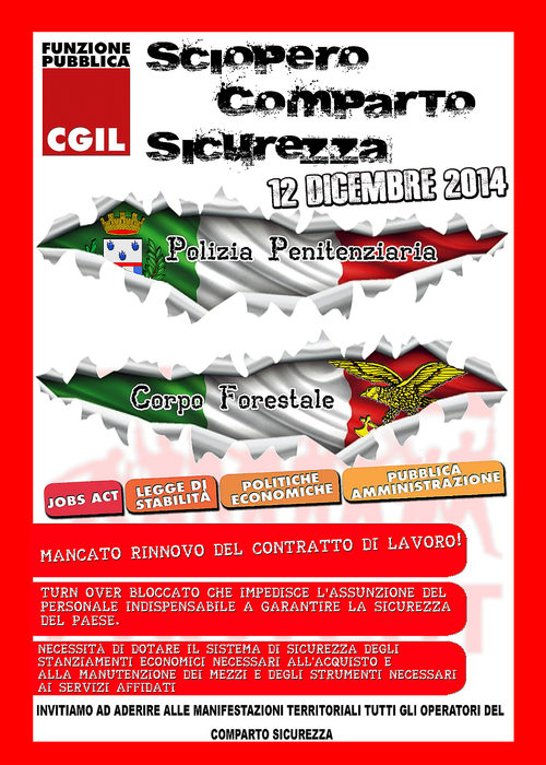 Dopo la grande manifestazione nazionale CGIL del 25 Ottobre scorso, in difesa di tutto il mondo del Lavoro, dopo la manifestazione nazionale unitaria dei lavoratori pubblici di FP CGIL – CISL FP – UIL FPL dell’8 Novembre u.s., il 12 Dicembre 2014 sarà SCIOPERO GENERALE NAZIONALE CONFEDERALE, con astensione per l’intera giornata lavorativa per tutti i lavoratori pubblici e privati, così come proclamato da CGIL e UIL, per protestare contro le irresponsabili scelte del governo sul lavoro e sostenere le proposte sindacali in merito alla riforma della Pubblica Amministrazione, Jobs Act, Legge di Stabilità e Politica economica.