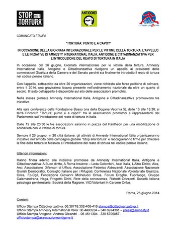 La FP CGIL, in occasione della giornata internazionale per le vittime della tortura, partecipa all’audizione della Commissione Giustizia della Camera dei Deputati e al dibattito sull’introduzione del reato di tortura nell’ordinamento italiano che si terrà presso la Sala Conferenze Fondazione Basso – Via della Dogana Vecchia, 5 – ore 16.00 – 18.30