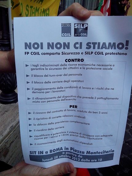 Dal 28 al 31 ottobre sit-in degli operatori dei tre Corpi di Polizia a Montecitorio. Roma, 28 ottobre 2013 “Malgrado le reiterate espressioni di alta considerazione e ringraziamento manifestate in più di un’occasione ufficiale dalle istituzioni ai lavoratori in divisa, per la complessa, disagiata e assai rischiosa opera prestata al servizio dello Stato, e a dispetto della specificità lavorativa che è stata loro riconosciuta per legge dal Parlamento nel 2010, sono ormai 5 anni che ai poliziotti viene negato il diritto al rinnovo del Contratto collettivo di lavoro, bloccate le indennità accessorie e funzionali e gli automatismi stipendiali maturati per le progressioni di carriera ottenute, bloccato il turn over del personale, il riordino delle funzioni e delle carriere, l’avvio della previdenza complementare”. Questo il contenuto di una nota congiunta di Fabrizio Fratini, Segretario Nazionale Fp Cgil, e Daniele Tissone, Segretario Generale Silp-per la Cgil, in merito al primo sit-in effettuato oggi in Piazza Montecitorio dalle due organizzazioni sindacali. “Lo avevamo preannunciato – continuano i due sindacalisti – di seguito all’unica occasione in cui ci è stato concesso di rappresentare al governo le ragioni della forte insoddisfazione manifestata dagli operatori della sicurezza per la feroce messa in discussione dei propri diritti e delle precarie condizioni di lavoro in cui sono obbligati a lavorare, causa gli ulteriori tagli lineari operati dall’attuale esecutivo anche con la legge di stabilità 2014 sui capitoli di bilancio delle amministrazioni interessate”. “Scelte irresponsabili – aggiungono Fratini e Tissone – che renderanno se possibile ancora meno efficace la risposta dello Stato ai bisogni di sicurezza della cittadinanza e del sistema di micro/macro imprese di un Paese che paradossalmente, pur ambendo al rilancio del suo sviluppo economico, continua a disinvestire sulla sicurezza, colpendo pesantemente gli operatori interessati, depotenziandone l’aspetto funzionale, professionale e motivazionale, puntando invece sul rifinanziamento delle pattuglie dei militari, che nulla di strutturale danno alla sicurezza”. “Il Governo Letta è chiamato ad assumersi la responsabilità di quanto sta provocando sul versante della sicurezza di fronte all’opinione pubblica. Da oggi con il sit-in a piazza Montecitorio, che manterremo fino al prossimo 31 ottobre, e poi in tutti i luoghi di lavoro della Polizia di Stato, della Polizia Penitenziaria e del Corpo Forestale dello Stato, saranno attivate iniziative di protesta e mobilitazione territoriale – concludono i due segretari – che permarranno fino a quando il Governo e il capo dell’esecutivo non ci daranno le risposte che la situazione esige”. —