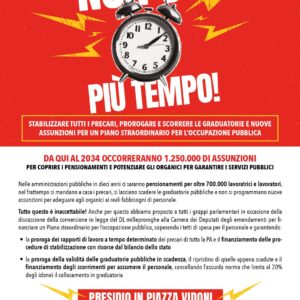 Domani 3 febbraio alle ore 15 a Roma, in piazza Vidoni, si terrà un sit in dal titolo “Non c’è più tempo” promosso da Fp Cgil per sollecitare il governo a “stabilizzare tutte le precarie e i precari della Pubblica amministrazione, prorogare e scorrere le graduatorie e prevedere nuove assunzioni attraverso un Piano straordinario per l’occupazione pubblica”.
