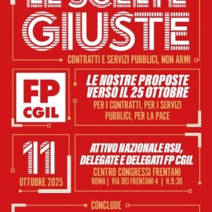 Si terrà sabato 11 ottobre 2025 a partire dalle ore 9.30, presso il Centro Congressi Frentani a Roma (via dei Frentani 4), l’attivo nazionale Rsu, delegate e delegati Fp Cgil dal titolo “Le scelte giuste. Contratti e servizi pubblici, non armi: le nostre proposte verso la manifestazione del 25 ottobre”.