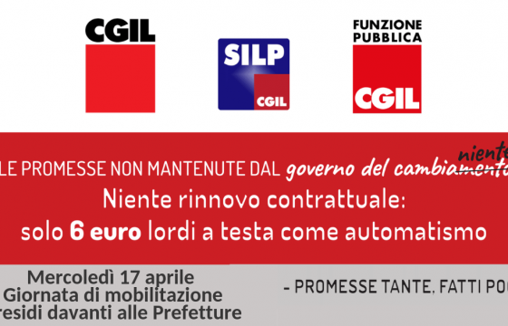 16 Aprile 2019 Contratti: Cgil-Fp-Silp, niente rinnovo per Polizia, domani in piazza Presidi davanti alle Prefetture, a Roma appuntamento in piazza Venezia “Niente rinnovo ...