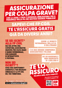 Sapevi che per legge potresti essere ritenuto responsabile di eventuali danni che il tuo lavoro può causare a persone o enti? Se sei un nostro iscritto, la Funzione Pubblica Cgil ti ha già attivato una polizza assicurativa che non ti costa nulla e che ti tutela per i rischi da colpa grave nel tuo lavoro. Un’assicurazione gratuita che ti tutela adesso, ma anche per il passato e per il futuro. Tutto chiaro e trasparente.
